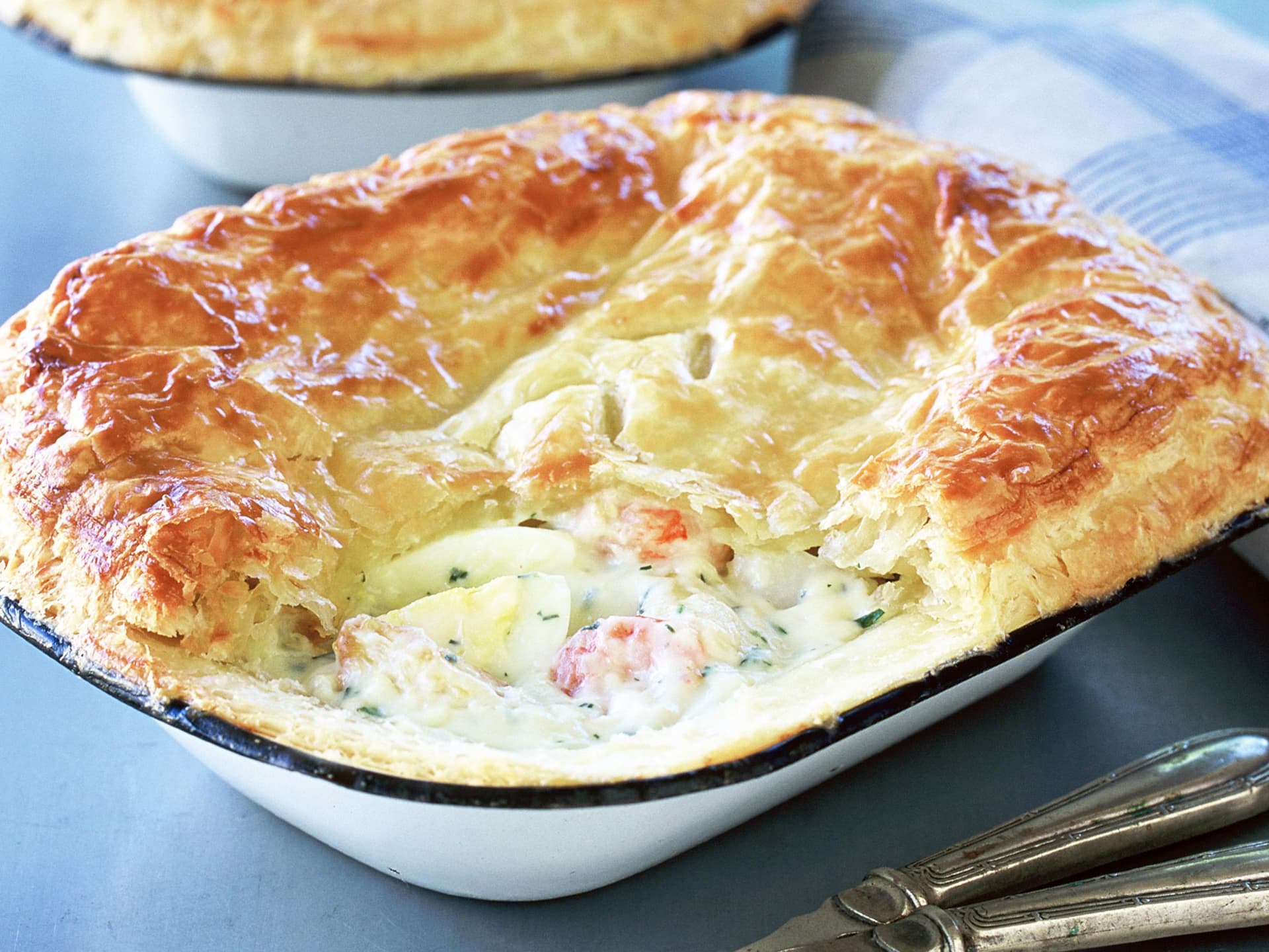 with Prawns and Salmon. This creamy seafood pie is just the perfect summer dinner. Made with a little white wine and a roux base, fresh herbs to finish off.