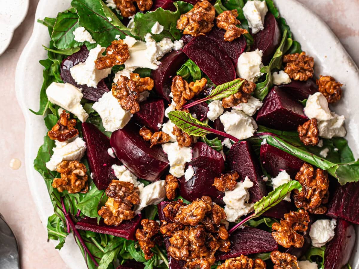 A fresh salad perfect for the beginning of warmer months. A rocket based salad tossed with roasted beetroot, goats cheese and crunchy walnuts.
