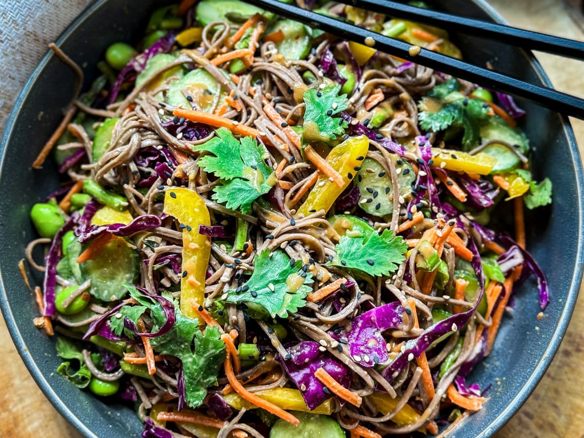 with Smoked Peanuts. Crunchy Asian Slaw with Sweet potato noodles, coriander, soy dressing and smoked peanuts. Great with a main meal or as a complete Meal
