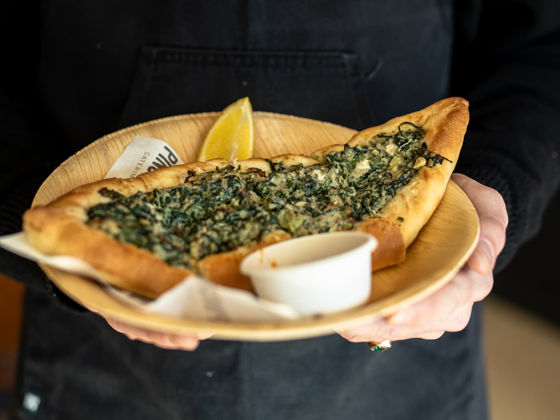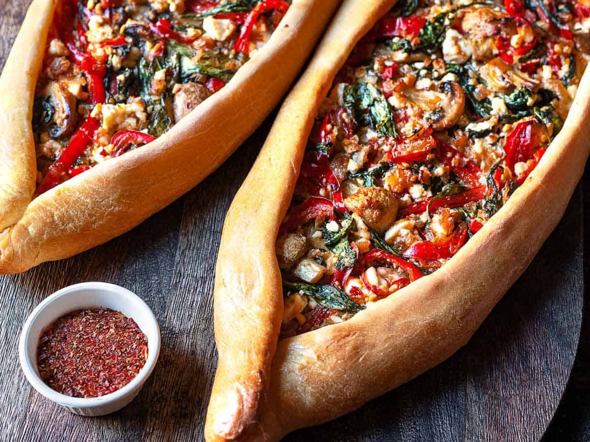 with Minted Yoghurt. Pide is the famous baked Turkish flat bread that comes stuffed with a variety of toppings, our vegetarian version with a Spanikopita - spinach, herb and cheese topping. Often described as a Turkish pizza, we serve ours with minted yoghurt. Serves 2 as a snack.