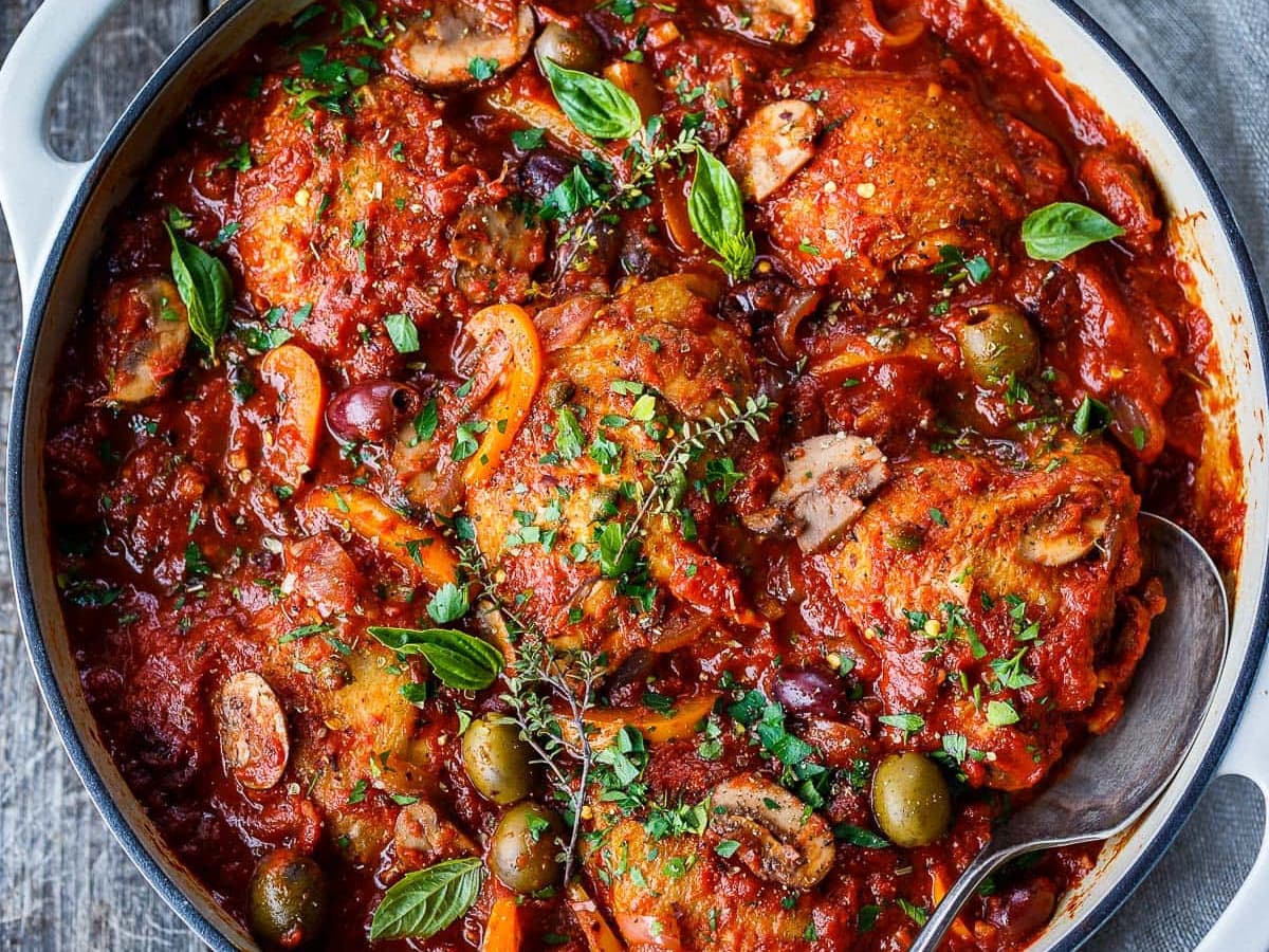 with Crispy Rosemary Potatoes. Chicken Cacciatore is a traditional Italian dish, with "Cacciatore" meaning "hunter" - it's a slow cooked dish based on whatever could be hunted or sourced at the time, and combined with common items from any Italian kitchen. Think fresh baked tomato, peppers, white wine, olives and herbs.