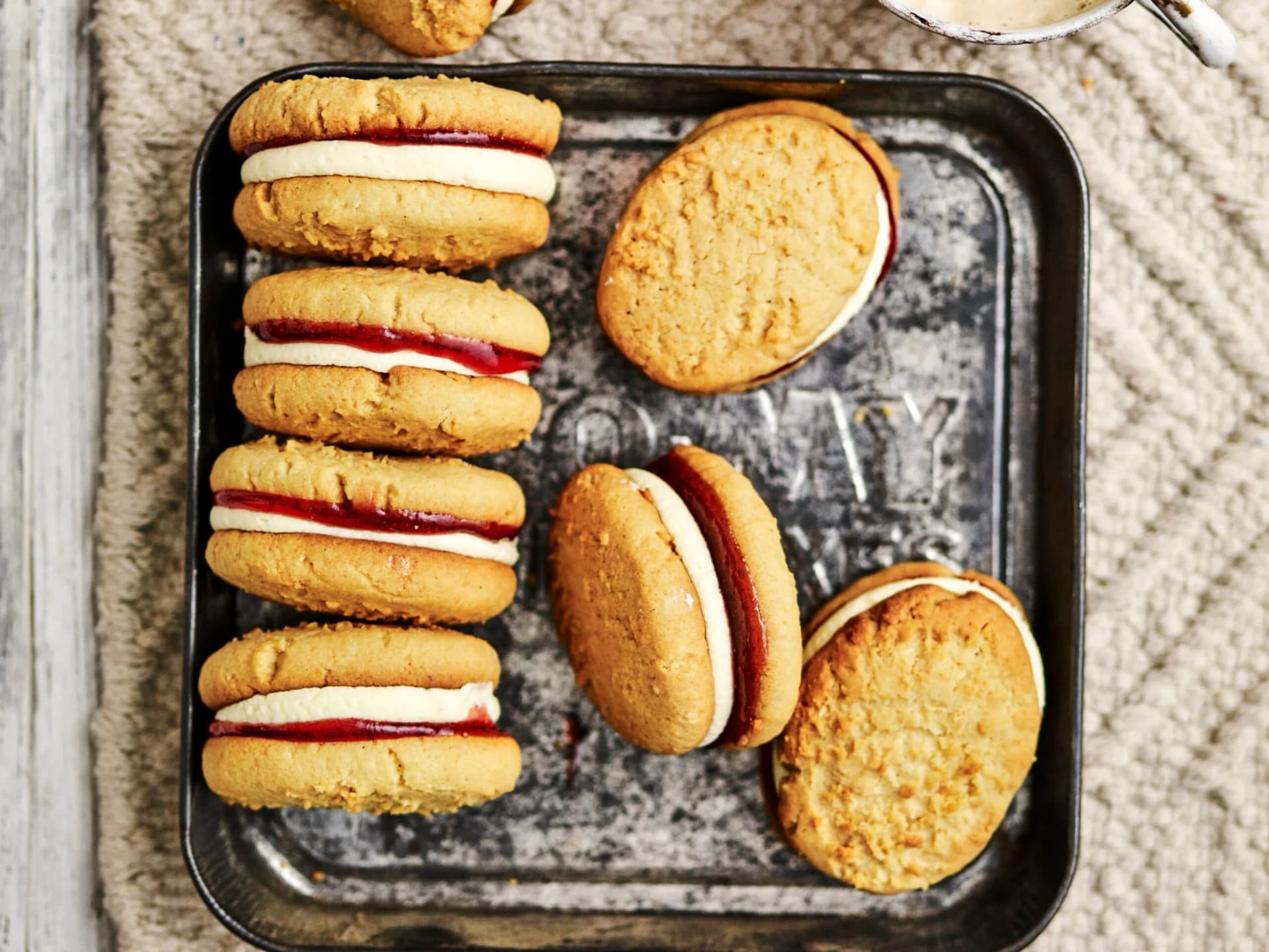 These are an old fashioned, mouth-watering biscuit filled with raspberry jam and a vanilla cream.