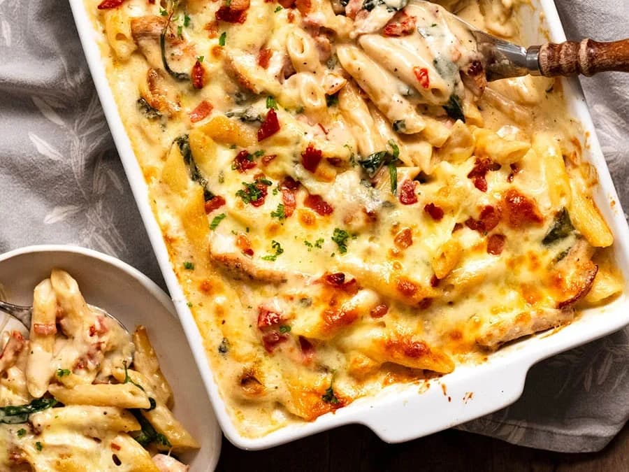Everybody's favourite dinner time meal. Creamy chicken sauce, sun-dried tomatoes, spinach, rigatoni and molten cheese.