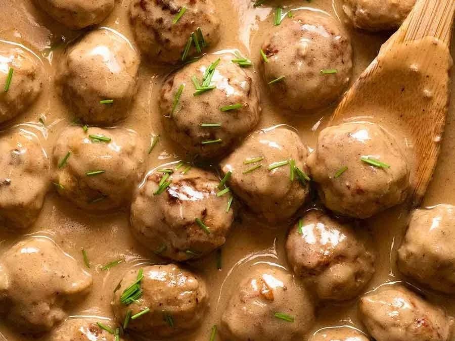 with Creamy Mushroom Gravy and Pilaf. Juicy meatballs smothered in a beautiful creamy mushroom gravy, with a hint of spicing that Swedish meatballs are known for. Made extra soft and extra tasty.