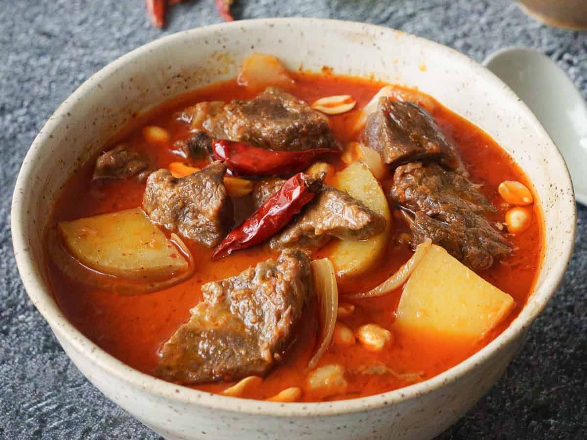 Tender beef and potatoes slow cooked in a coconut based curry of our handmade spice paste. Served with aromatic rice, chilli cucumbers and the crunch of peanuts.