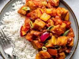 Vegetable oil, Stir Frying [Green capsicum, Red capsicum, Pineapple, Onion, Oil, Ginger, Garlic], Sweet & Sour Sauce [Water, Apple cider vinegar, White sugar, Pineapple juice, Ketchup, Light soy sauce (Wheat), Cornflour (Wheat), Oyster sauce (Wheat, Mollusc, Soy), Worcestershire sauce (Wheat, Fish)], Pork scotch roast, White rice, Onion, Cornflour (Wheat), Light soy sauce (Wheat), Garlic, Baking soda, Ginger