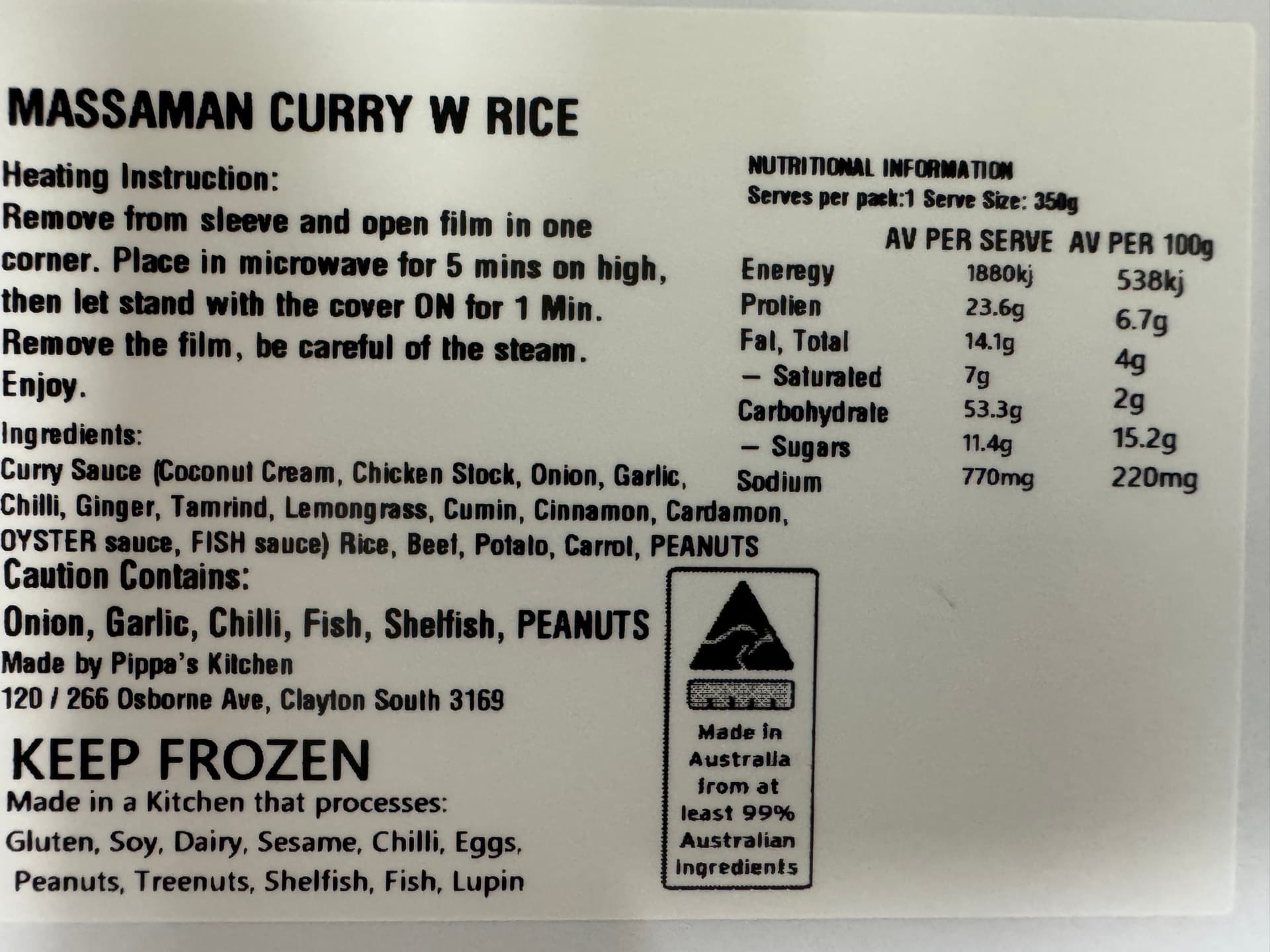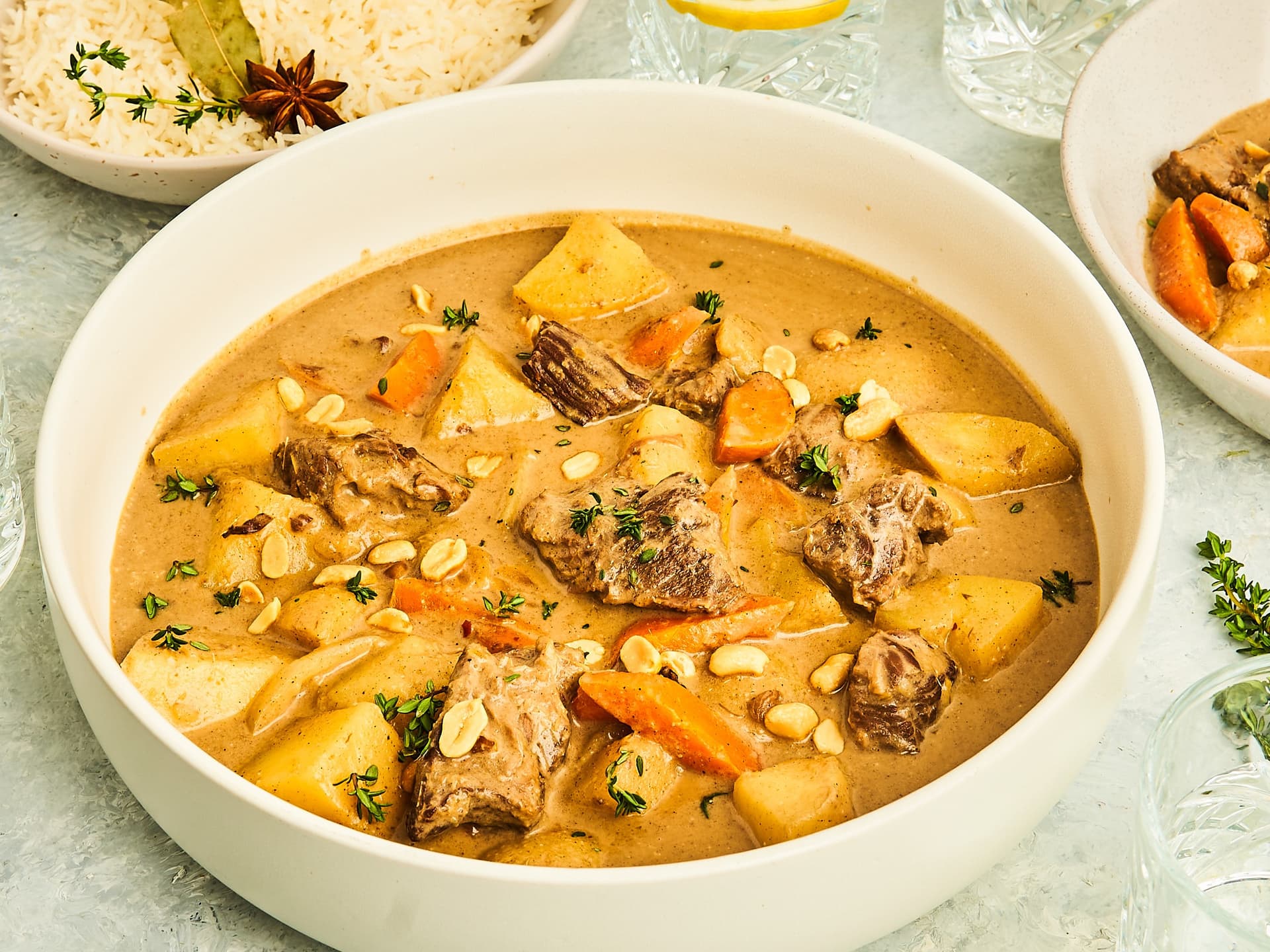 Tender Beef slow cooked in our homemade fragrant curry paste with silky coconut cream, together with soft potatoes and white rice.
