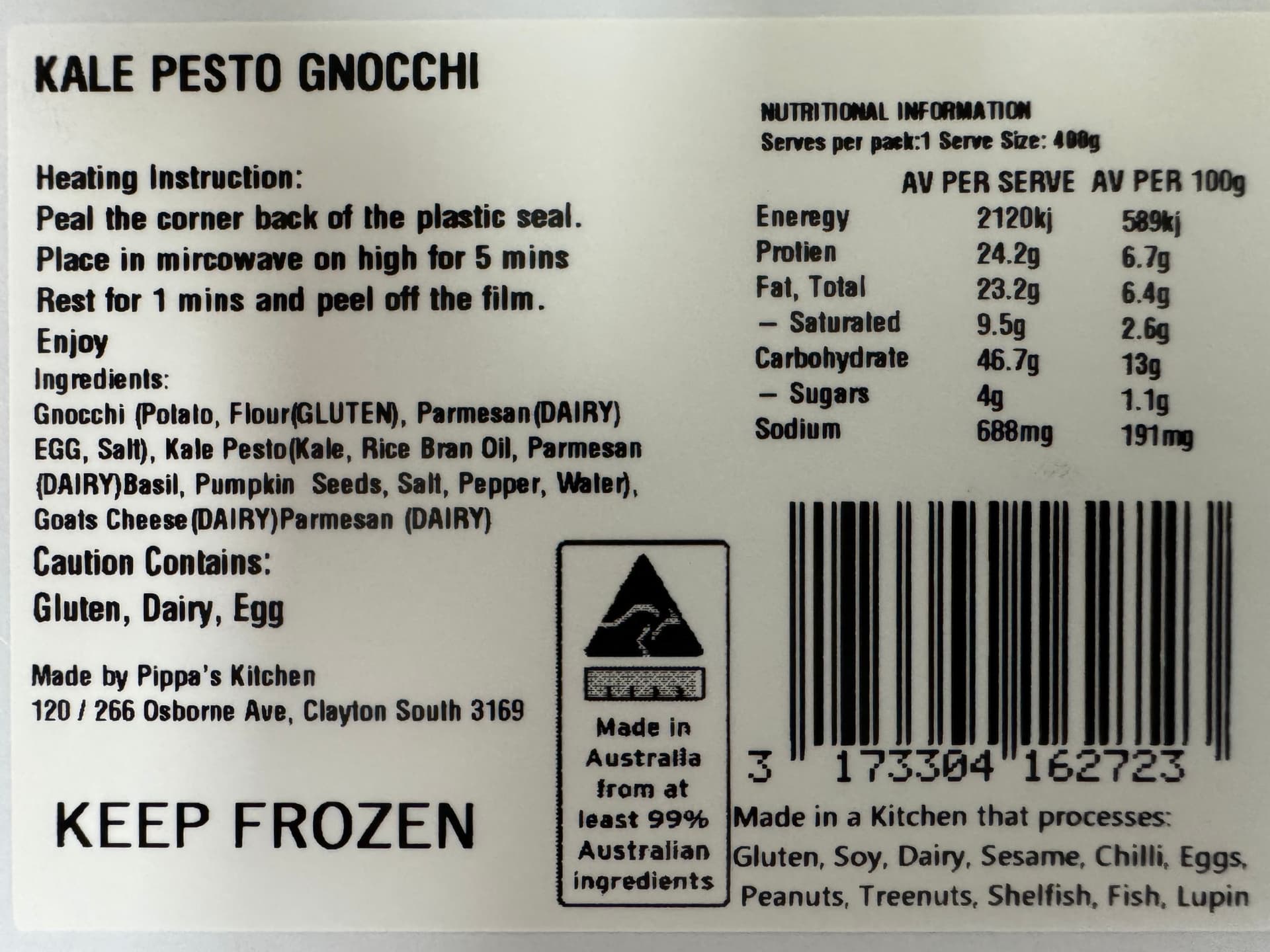 Tray Meal â Frozen â 350g Hand rolled spelt gnocchi together with a tasty green kale pesto, (made with pumpkin seeds) and creamy goats cheese. Even the meat lovers will be smashing this one!
