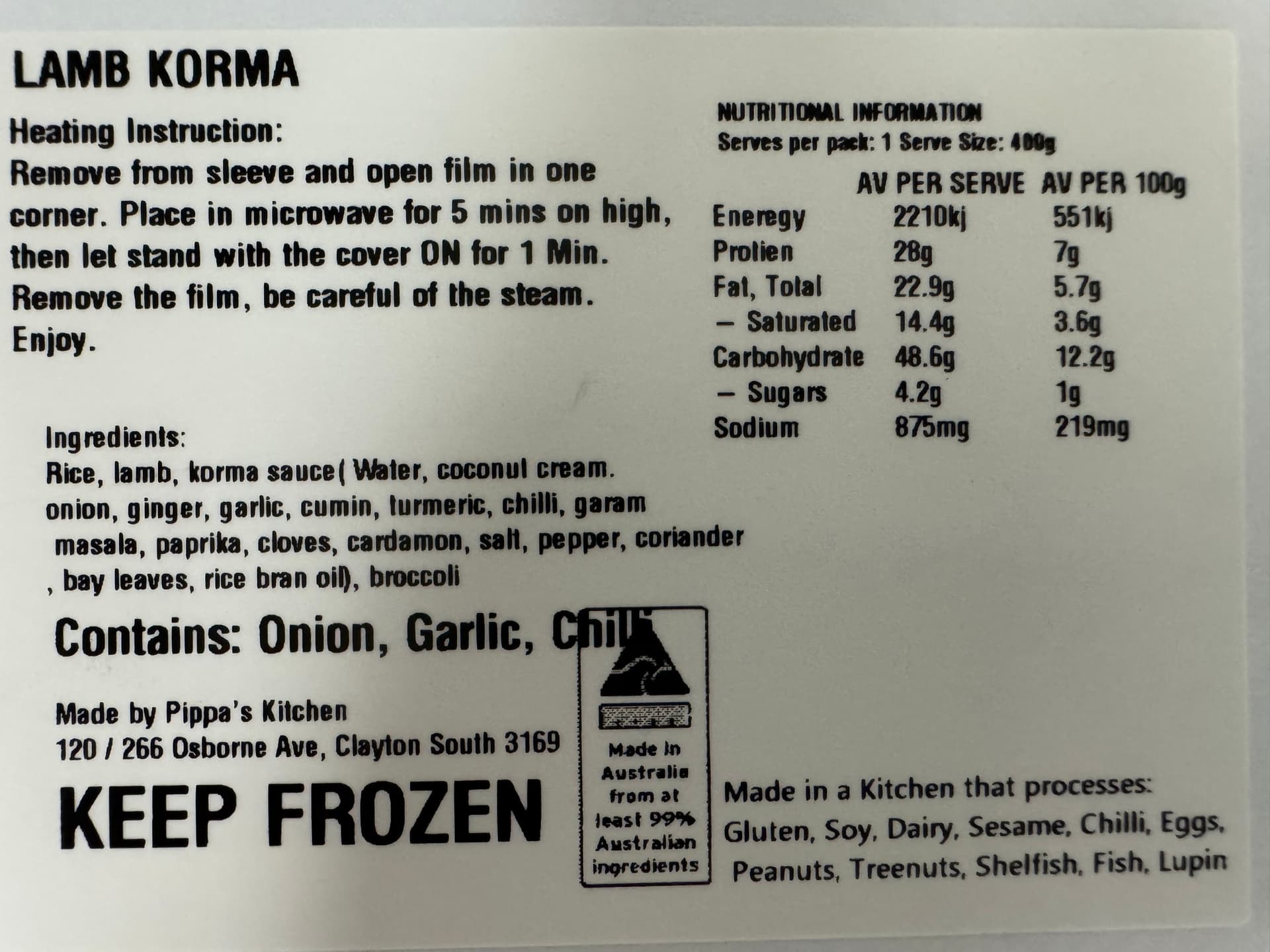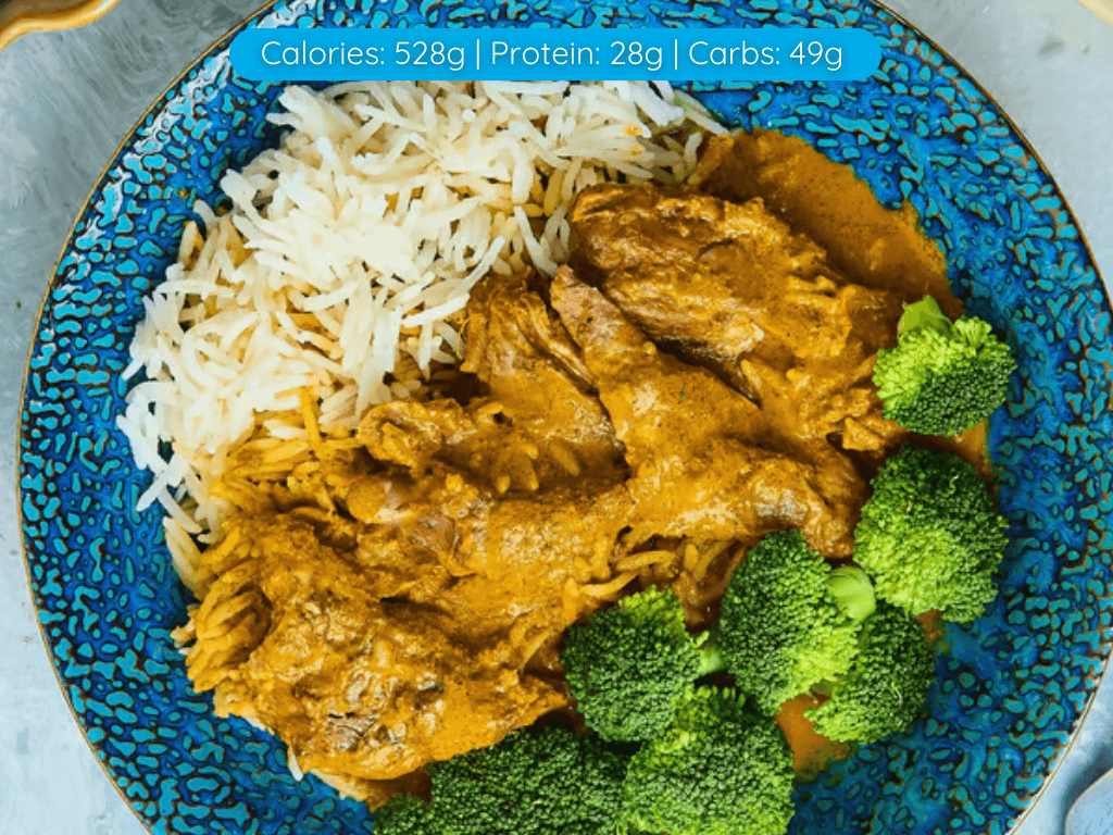 12 hour slow cooked organic lamb shoulder together with a flavoursome korma sauce, broccoli and white rice.