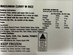 Carrot, Onion, Garlic, Ginger, Beef, Chicken stock, Potato, Lemongrass, GF Fish sauce, Oyster sauce (GF) (Mollusc, Soy), Peanut butter, Coriander, Tamarind (Sulphites), Chilli, Spices, Kaffir lime leaves