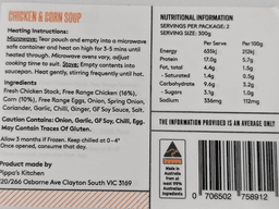 Chicken stock, Corn, Free-range eggs, Chicken, Onion, Spring onion, Soy (GF), Ginger, Coriander, Garlic, Salt, Chilli