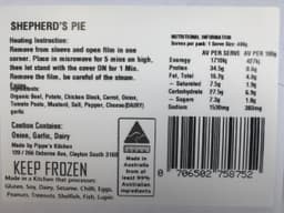 Organic beef, Potato, Carrot, Onion, Tomato paste, Dijon mustard, Chicken stock, Parmesan (Milk), Salt, Black pepper