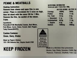 Wheat pasta, Meatballs [Beef mince, Fennel seeds, Tomato puree, Carrot, Chicken stock, Pork mince, Onion, Salt, Pepper], Tasty cheese (Milk)