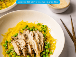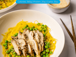 Rice noodles, Chicken thigh fillets, Honey, Sesame, Chicken stock, Garlic, Ginger, Chilli, Turmeric, Onion, Peanut butter, Coriander, Lemongrass, Coconut cream, Soy (GF)