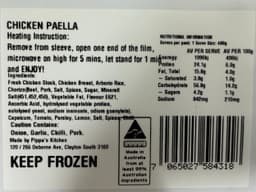 Arborio rice, Chicken stock, Chicken, Capsicum, Beef, Pork, Salt, Spices, Sugar, Mineral salt, Vegetable fat (Milk, Soy), E621 (Soy), Ascorbic acid, Hydrolysed vegetable protein (Wheat, Soy), Autolysed yeast (Wheat), Sodium insinuate, Sodium guanylate, Tomato, Parsley, Lemon, Chilli