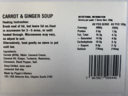 Carrot, Water, Coconut cream, Ginger, Coconut oil, Turmeric, Rosemary, Cinnamon, Black pepper, Salt