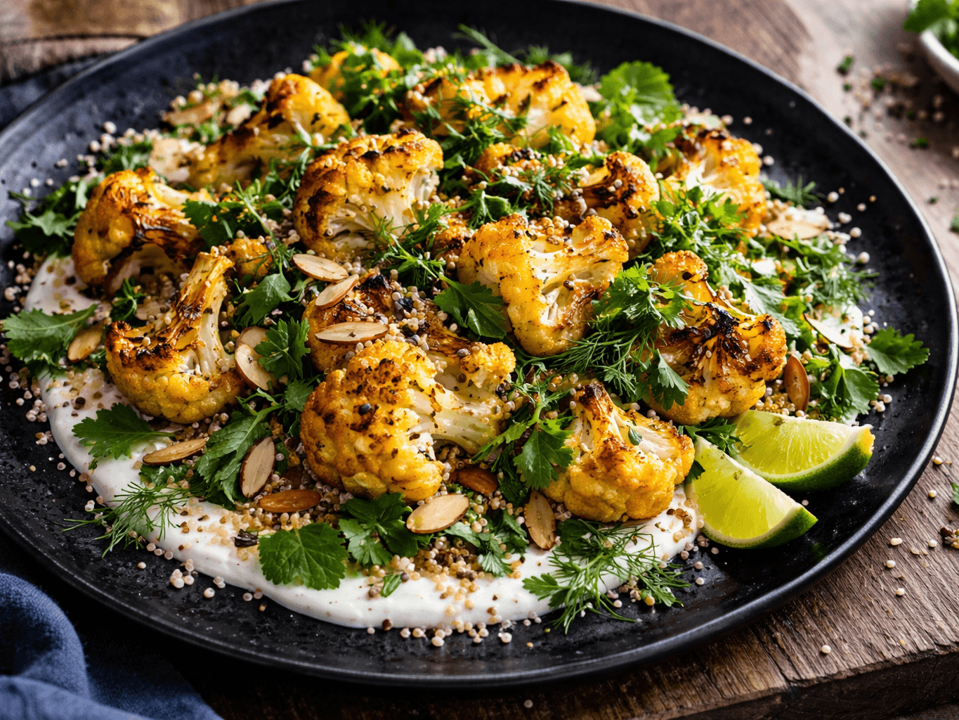 Cauliflower takes centre stage in this vibrant salad — roasted until golden, with edges that are just a little charred for that deep, nutty flavour. It’s layered over a smooth, tangy yoghurt dressing and scattered with puffed quinoa for crunch, slivered almonds for richness, and a generous handful of fresh herbs: coriander, mint, dill, and parsley. The finish is brightened with a sprinkle of nigella seeds and a squeeze of lime, bringing the whole dish together in a balance of texture and freshness. It’s light yet satisfying, earthy yet zesty — a perfect example of homestyle food made with care, where every ingredient has its moment.