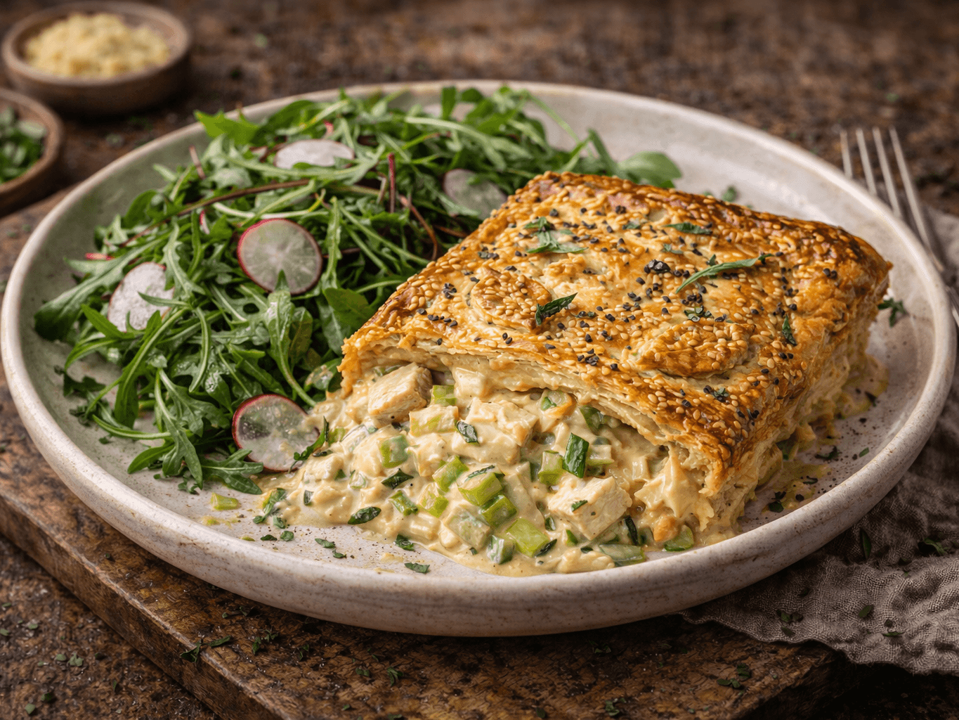 A proper, feel-good classic. Tender chicken, sweet leeks, and a creamy, tarragon-spiked sauce, all wrapped up in golden, flaky pastry. It's rich, hearty, and just a little bit fancy - perfect for a cosy night in or impressing your mates. Serve it up with a fresh salad or buttery mash, and you’re sorted.