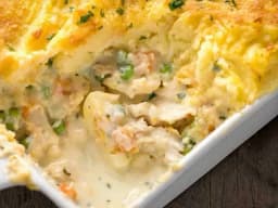 Cottage Pie Mash [Sebago potato, Milk - Cows, Unsalted butter (Milk), Cream - thickened (Milk), Sea salt, Ground Black Pepper], Milk - Cows, Bechamel [Milk - Cows, Unsalted butter (Milk), Flour plain (Wheat), Sea salt, Pepper white ground], Trevally (Fish), Smoked salmon (Fish), Onion, Peas Baby Frozen, Parsley, Carrots, Celery (stalk), Parmesan Cheese Grated (Milk), Whole cloves, Garlic, Tarragon, Sea salt