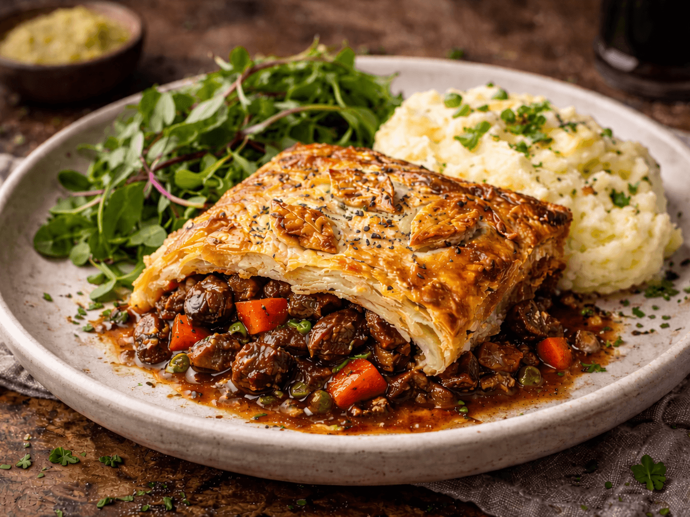 A proper, feel-good classic. Tender chicken, sweet leeks, and a creamy, tarragon-spiked sauce, all wrapped up in golden, flaky pastry. It's rich, hearty, and just a little bit fancy - perfect for a cosy night in or impressing your mates. Serve it up with a fresh salad or buttery mash, and you’re sorted.