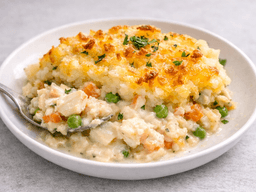 Cottage Pie Mash [Sebago potato, Milk - Cows, Unsalted butter (Milk), Cream - thickened (Milk), Sea salt, Ground Black Pepper], Milk - Cows, Bechamel [Milk - Cows, Unsalted butter (Milk), Flour plain (Wheat), Sea salt, Pepper white ground], Trevally (Fish), Smoked salmon (Fish), Onion, Peas Baby Frozen, Parsley, Carrots, Celery (stalk), Parmesan Cheese Grated (Milk), Whole cloves, Garlic, Tarragon, Sea salt