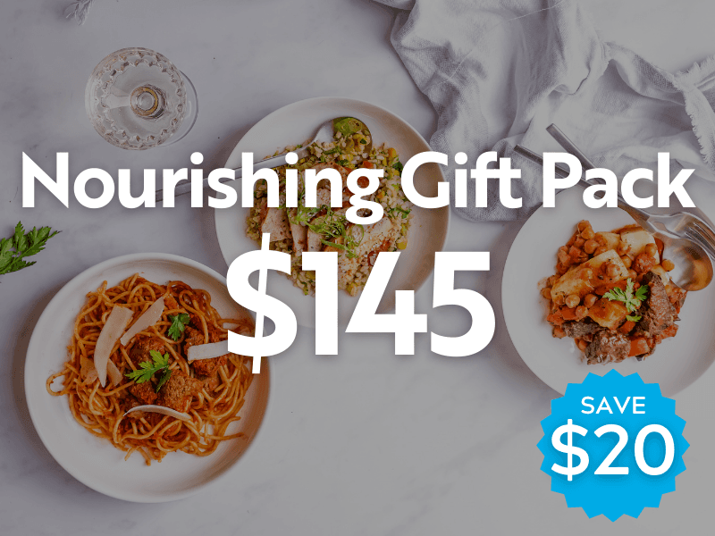 Need a gift idea? Our Nourishing Gift Box is the perfect gift to give. Food is the greatest gift. It saves time and money when the person in need will be focusing on more important things than getting dinner ready. Think a gift for a sick friend, or new mum Trust me, cooking is the last thing on your mind when you have a new baby. You, or your friend, will receive $160 worth here, save $15