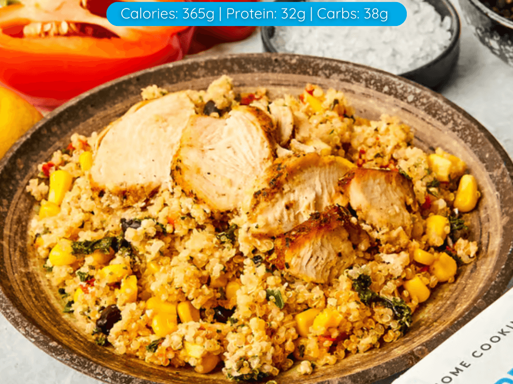 Tray Meal – Frozen – 350g Spicy seared chicken breast, sliced over a bed of quinoa salad, including corn, capsicum, black beans and kale. A citrus coconut sauce drizzled over the top, makes this perfect light dinner for a pleasant evening. 370 Cals.
