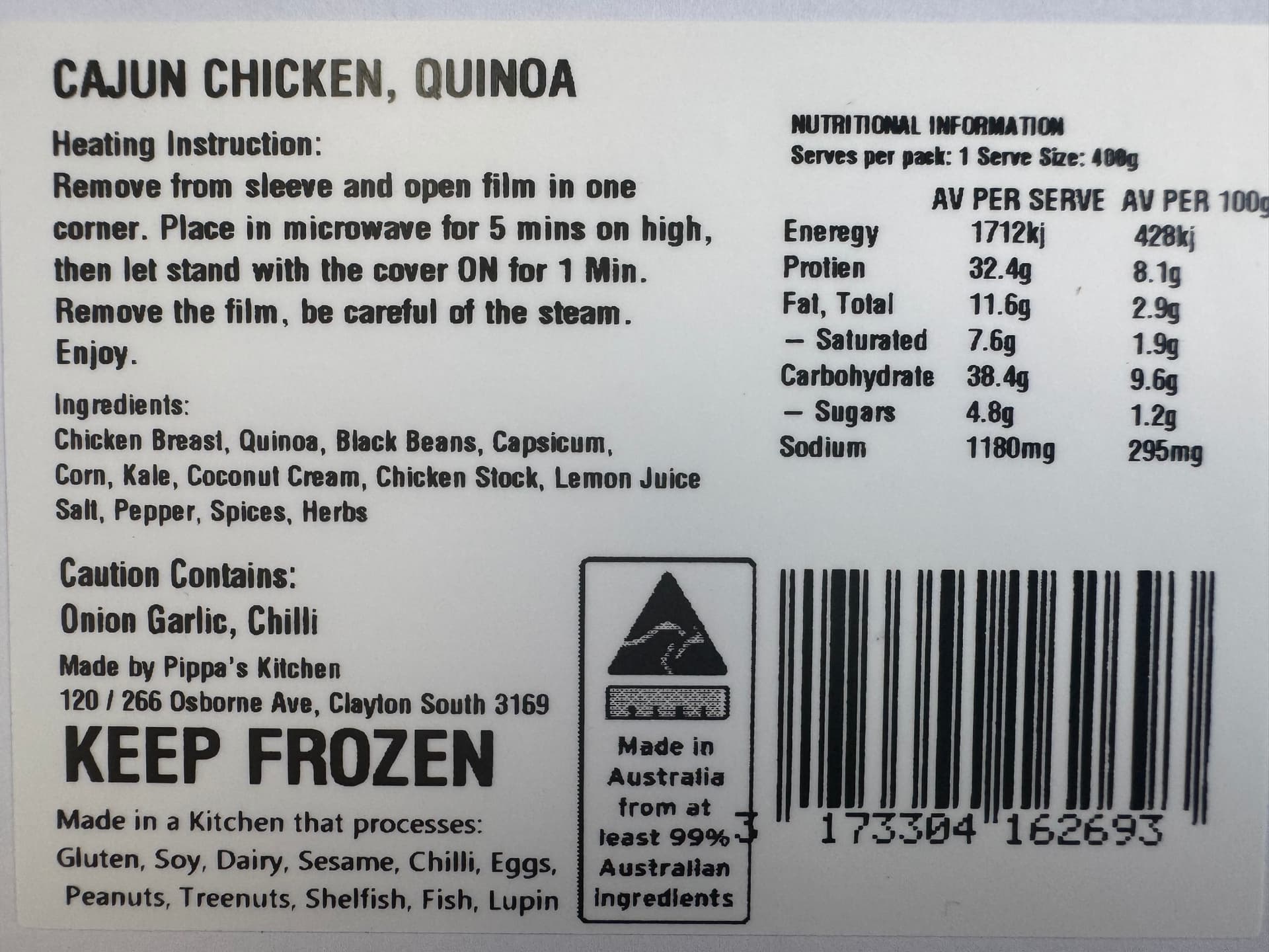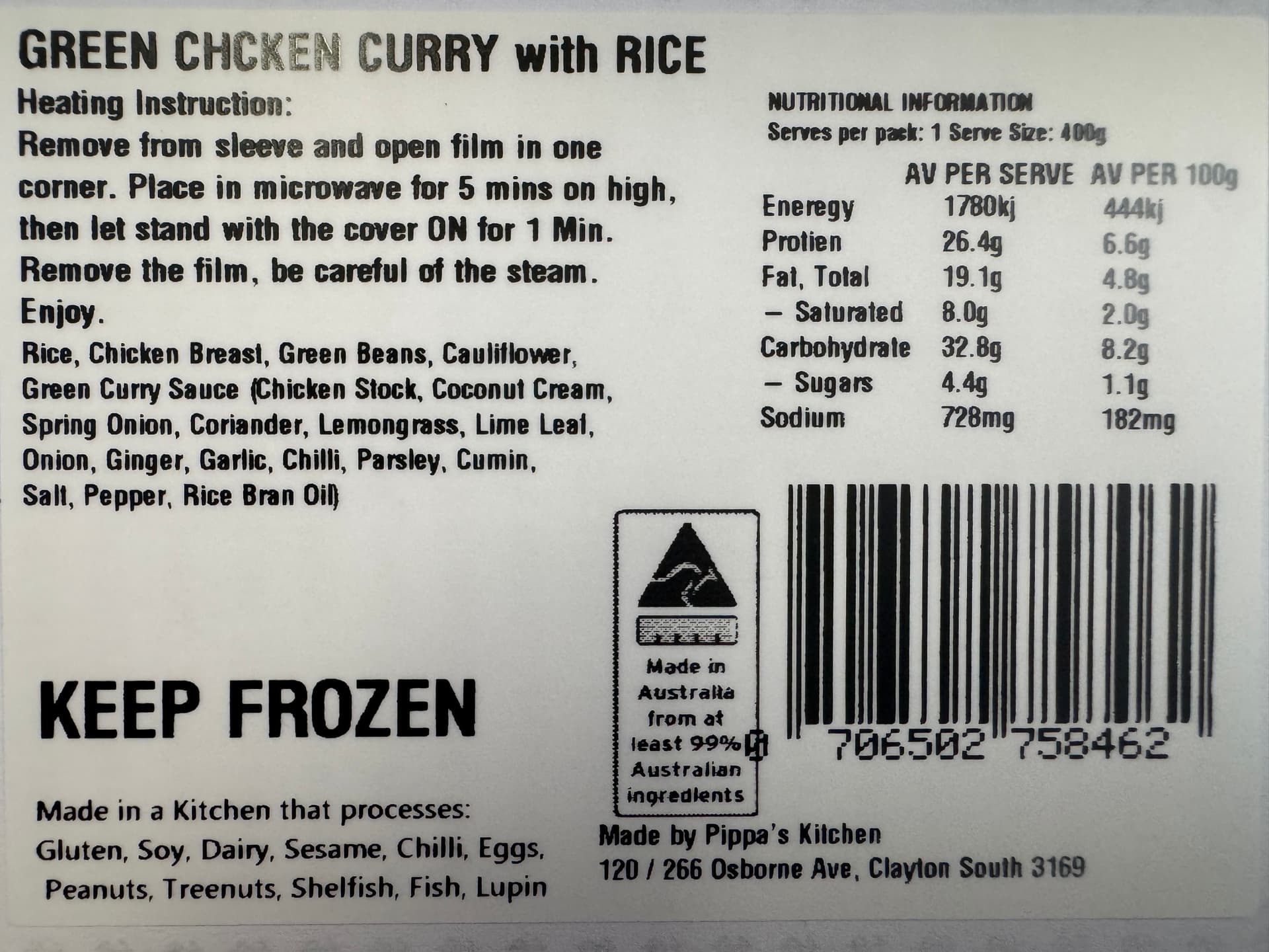 Thai Green Chicken Curry, roasted cauliflower and broccoli – no rice included here! Thai flavours of lemongrass, kaffir lime, chilli, coriander, spring onion, garlic and coconut cream, leaves you with a great taste in your mouth. *** While every effort is made to ensure there is no gluten present, we do use gluten in our kitchen and traces may be found*** Gently warm in pot until simmer. Add your own rice. Enjoy .