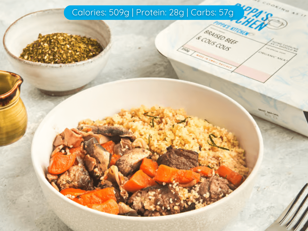 Slow cooked beef with bacon, mushrooms, carrots, onion, garlic and fresh herbs, together with fluffy cous cous and light red wine sauce.