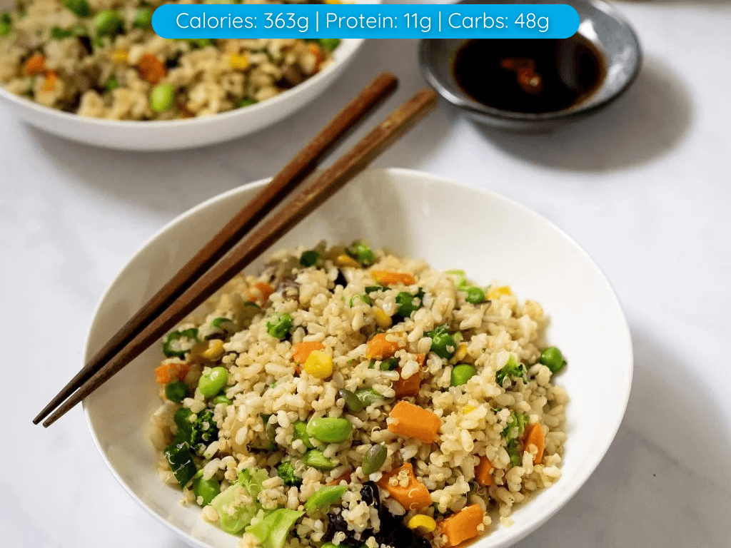 Started with Ginger, chilli, garlic, coriander and onion, sautéed and deglazed with Mega Chef GF Soy sauce. Thrown in with sautéed capsicum, corn off the cob, and green peas – mixed with brown rice, scrambled free range egg, free range chicken and fresh herbs. Yes Please! (499 Cals)
