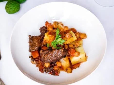 Hello there, good to see you! Slow cooked Moroccan Beef Tagine, seasoned with ginger and cinnamon, roasted carrots, chickpeas, prunes and paired with roasted potatoes, finished with a flavoursome jus. Sweet, savoury, hearty and delicious. Microwave on high for 5 mins, let stand for 1 mins. Enjoy 455cals.