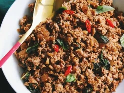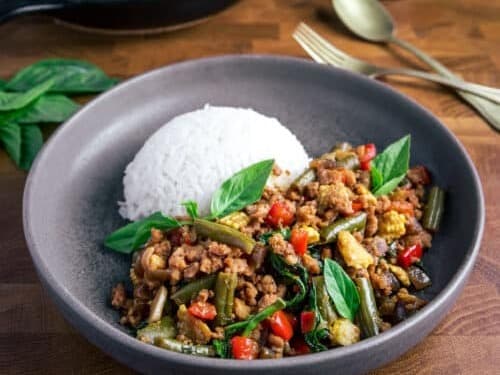 Indulge in the authentic flavors of Thailand with our Thai Basil Pork Stir Fry (Pad Kra Pao). Featuring savory minced pork stir-fried with aromatic basil and spices. Just need to add your own choice of rice to complete the meal.