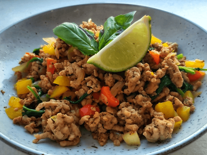 Enjoy the vibrant taste of our vegan take on Pad Kra Pao with this Thai Basil Mince Stir Fry. Featuring plant-based mince infused with aromatic basil and traditional Thai spices. Just need to add your one choice of rice to complete the meal.