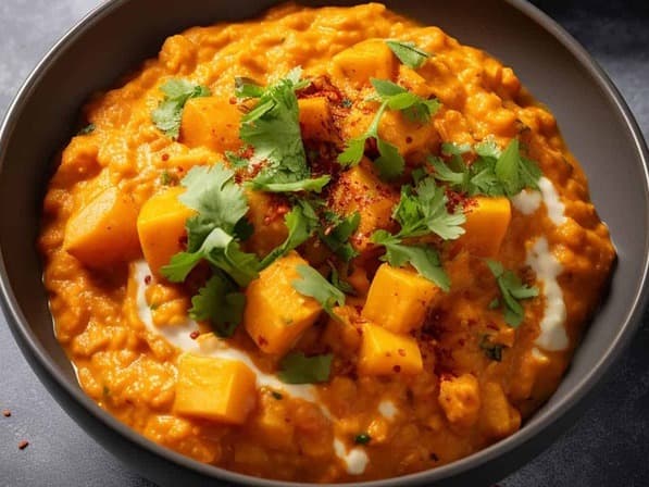 Vegan Massaman Curry is a rich and creamy and midly spicy made with sweet potatoes, red lentil in a base of coconut milk and spices.