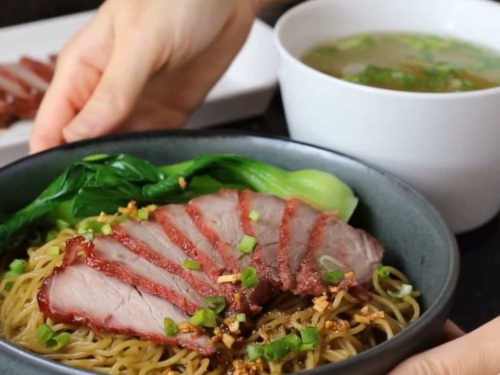 Char Siu BBQ Pork with Egg Noodles is a delightful take-home meal. Tender slices of sweet and savory char siu pork are served on a bed of springy egg noodles. The pork is grilled to perfection, while the noodles provide a satisfying texture. Garnished with blanched greens for freshness, this dish brings the flavors of Chinese cuisine straight to your table.