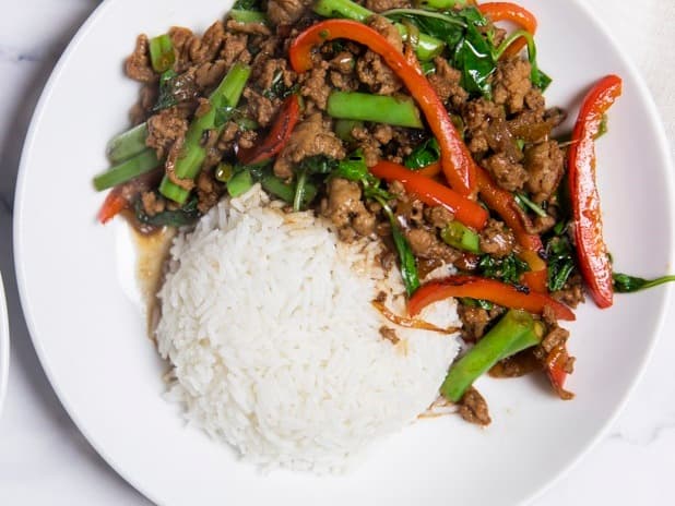 Indulge in the authentic flavors of Thailand with our Thai Basil Pork Stir Fry (Pad Kra Pao). Featuring savory minced pork stir-fried with aromatic basil and spices, this dish is paired with fluffy white rice for a satisfying meal. Simply reheat and enjoy this delicious and convenient ready-made meal.