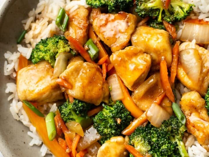Tender chicken and crisp vegetables sautéed in a savory-sweet Cantonese sauce, served over fluffy white rice for a complete, ready-made meal.
