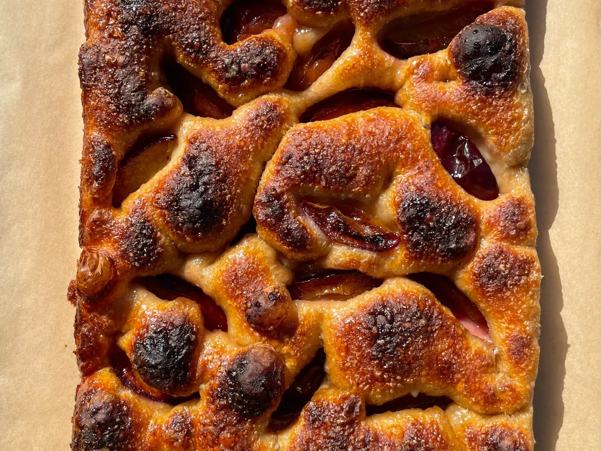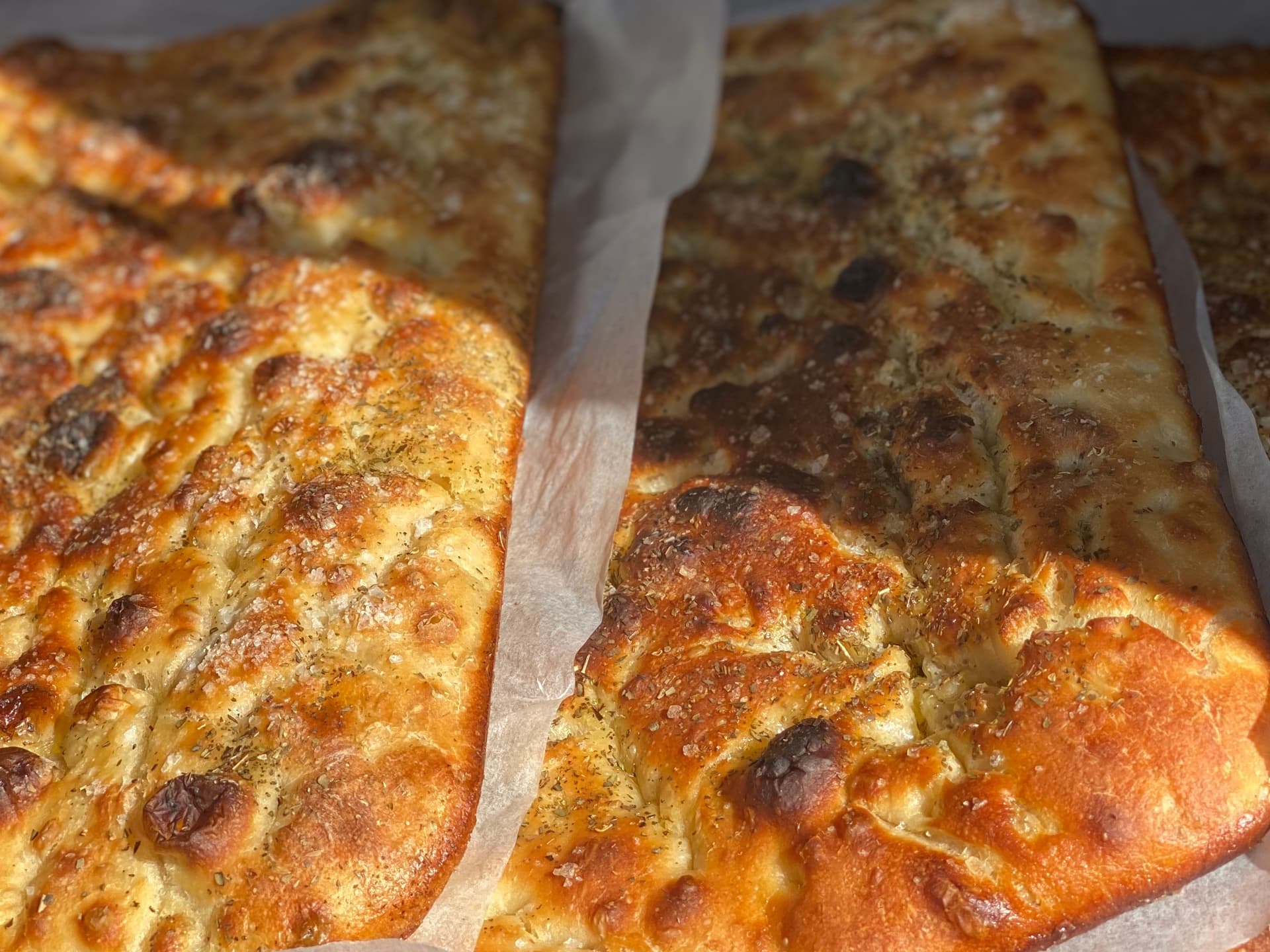 Our fresh focaccia, salty, fluffy, perfect for any saucy dish! Buttery slow cooked garlic to finish