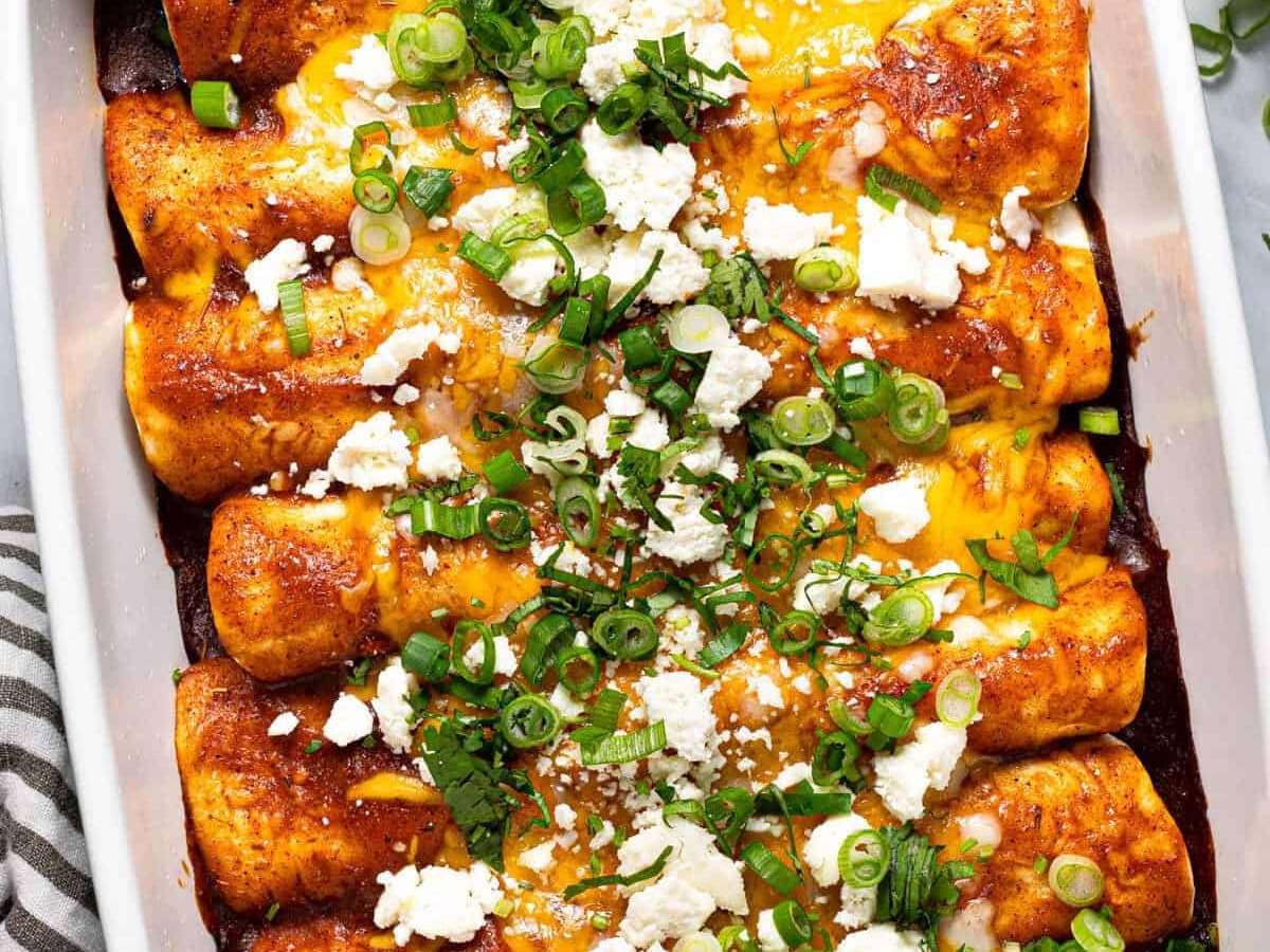 These chorizo enchiladas are made for those Mexican lovers out there! This one is super popular! Subtle kick from the chorizo, cooked in an epic Mexican sauce w beans & roasted veg rolled in tortillas w cheddar!