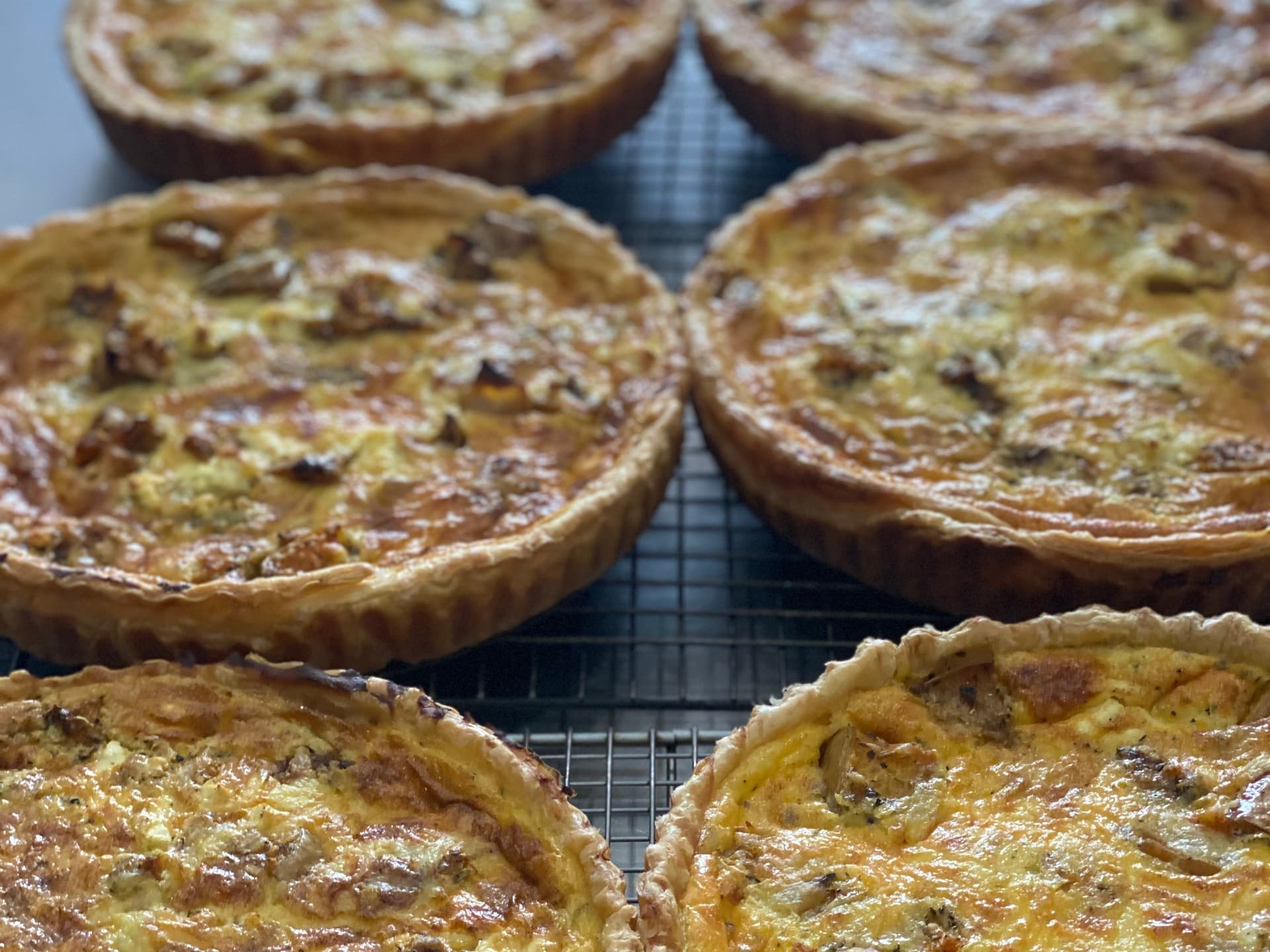 Sautéed button mushrooms, slow cooked onions, dijon, our creamy egg mixture, topped off with feta & parmesan all baked in crisp puff pastry (gf).