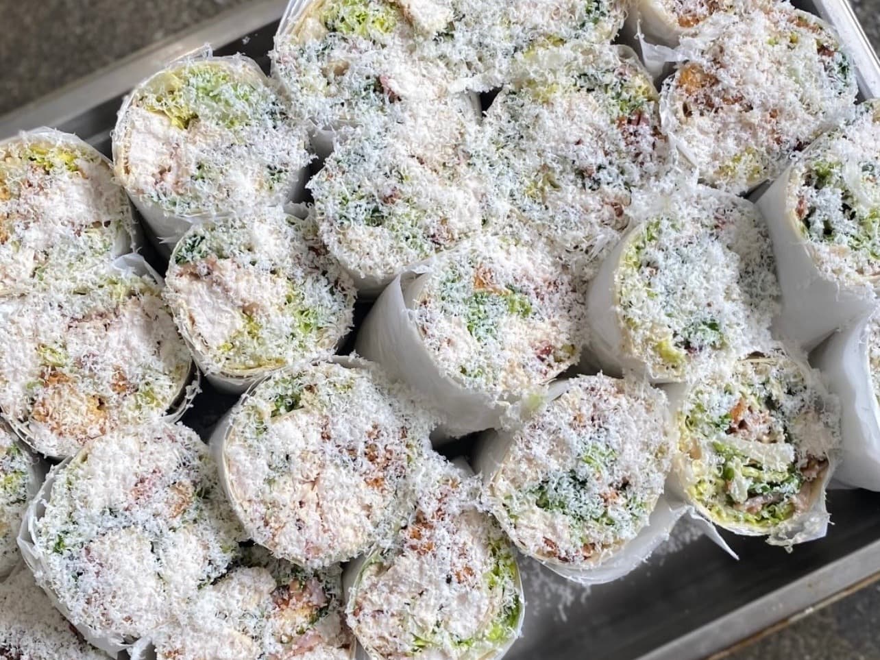 If you love a caesar salad, this one is for you! Folded in a wrap with a heavy shaving of parmesan on top. Serve as is, or pop into your toaster!