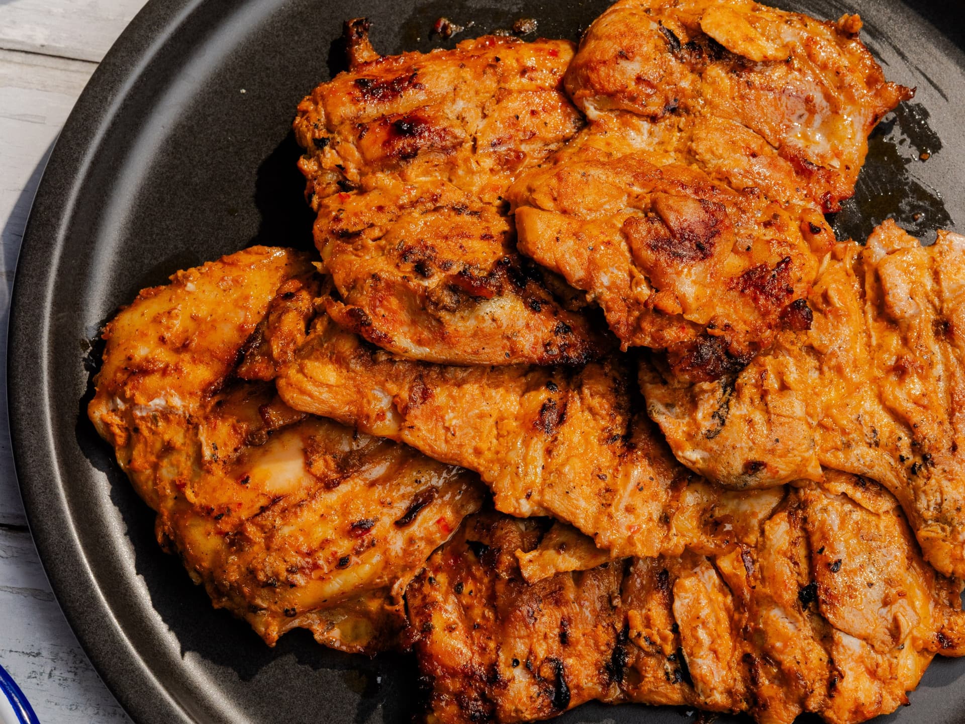 Chicken thighs, Red capsicum, Lemon juice, Onion, Red, Red Wine vinegar, Olive oil, Salt, Garlic, Smoked Paprika, Red chilli, Oregano, White pepper, Lemon zest, Bay leaves