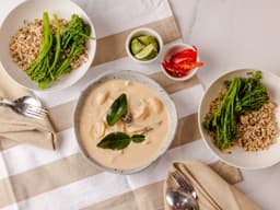 Coconut milk, Prawns (Crustacean), Eggplant, Maeploy red curry paste (Soy), Olive oil, Lime juice, Brown sugar, Lime leaves