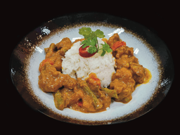 Spicy, tangy and tender. Soft lamb chunks, tender potatoes, carrots and green beans, slathered in a delicious red curry-based sauce. Simply classic and served next to a bed of fluffy white rice.