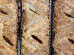 Bolognese Sauce [Crushed tomato, Mirepoix (onions, carrots, celery), Beef Mince., Tomato paste, Water, Red wine, Extra virgin olive oil, Dried oregano, Salt, Garlic], Puff pastry (Wheat), Bechamel Sauce [Milk, Plain flour (Wheat), Unsalted butter (Milk), Salt, Pepper ground, Nutmeg], Sesame seed, Egg Wash Mix [Eggs, Milk]