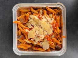 A hearty vegetarian penne pasta, served in a Chilli, Eggplant & tomato Sugo with basil & parmesan
