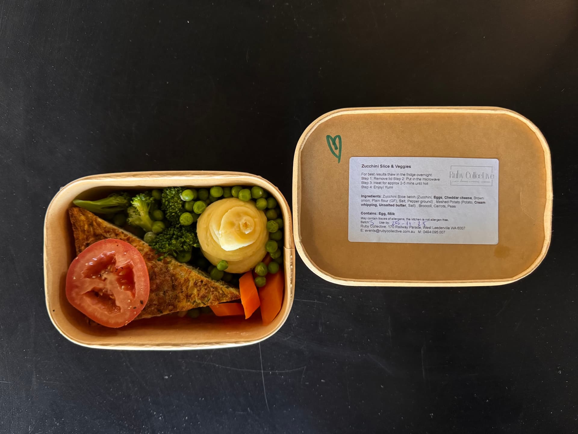 A savoury delight featuring zucchini, fresh vegetables tasty cheese, all baked together in a fluffy egg frittata. Served with seasonal veg & mash for a balanced meal