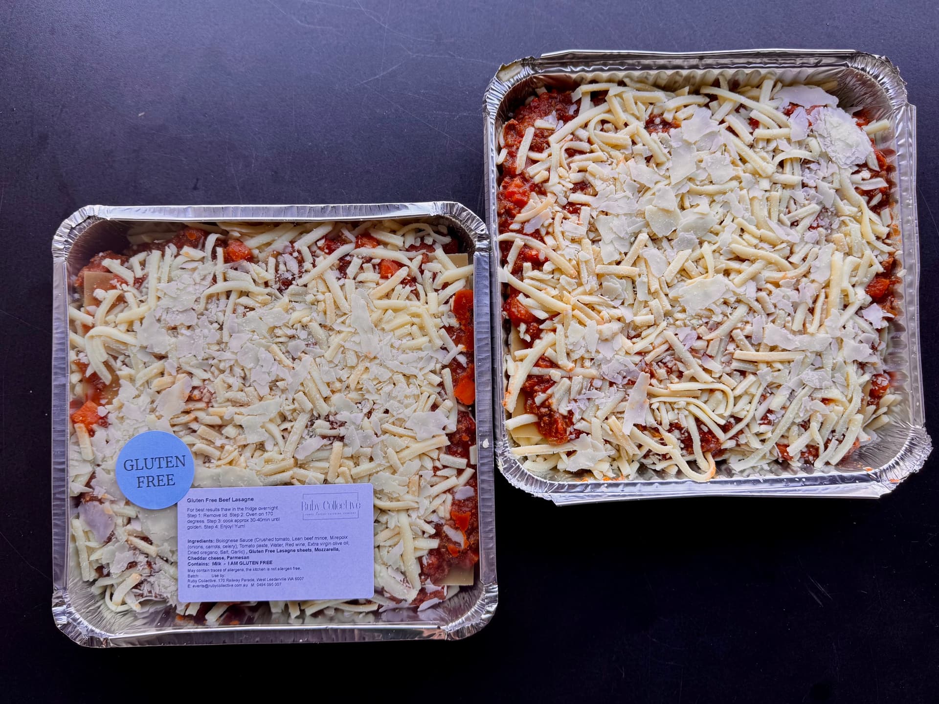 Gluten-Free Beef Lasagne Gluten-free lasagne sheets layered with rich, slow-cooked bolognese, finished with a golden blend of mozzarella, cheddar, and parmesan. All the comfort of a classic, made GF friendly.