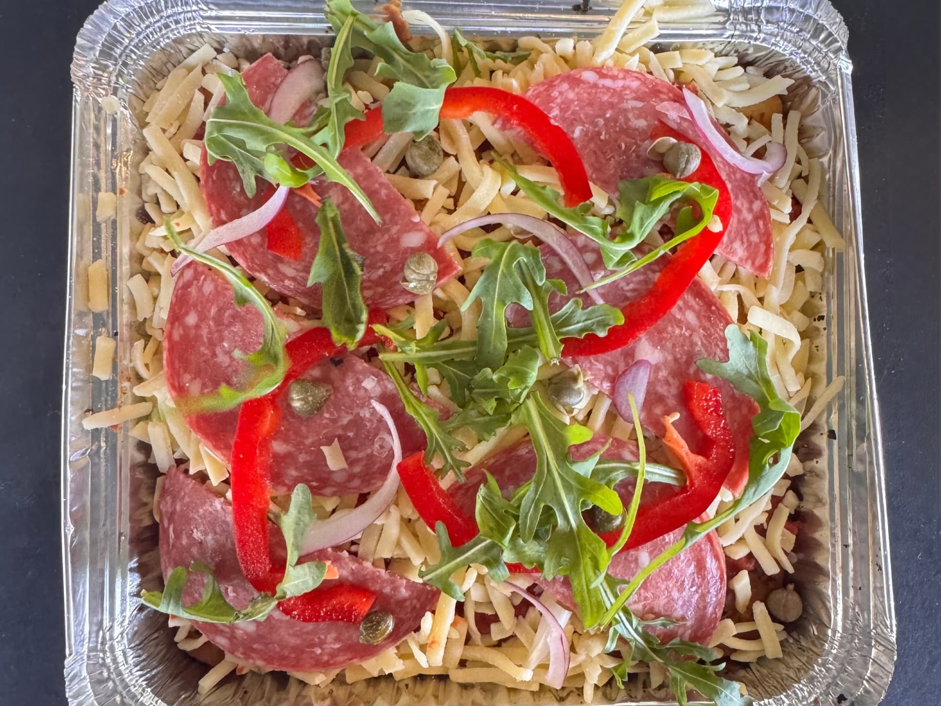 A bold and flavour-packed classic. Topped with salami, sweet red onion, roasted red capsicum, rich tomato sauce, and melted mozzarella — finished with a handful of fresh rocket for a peppery kick. The perfect balance of savoury goodness, and gooey cheese.