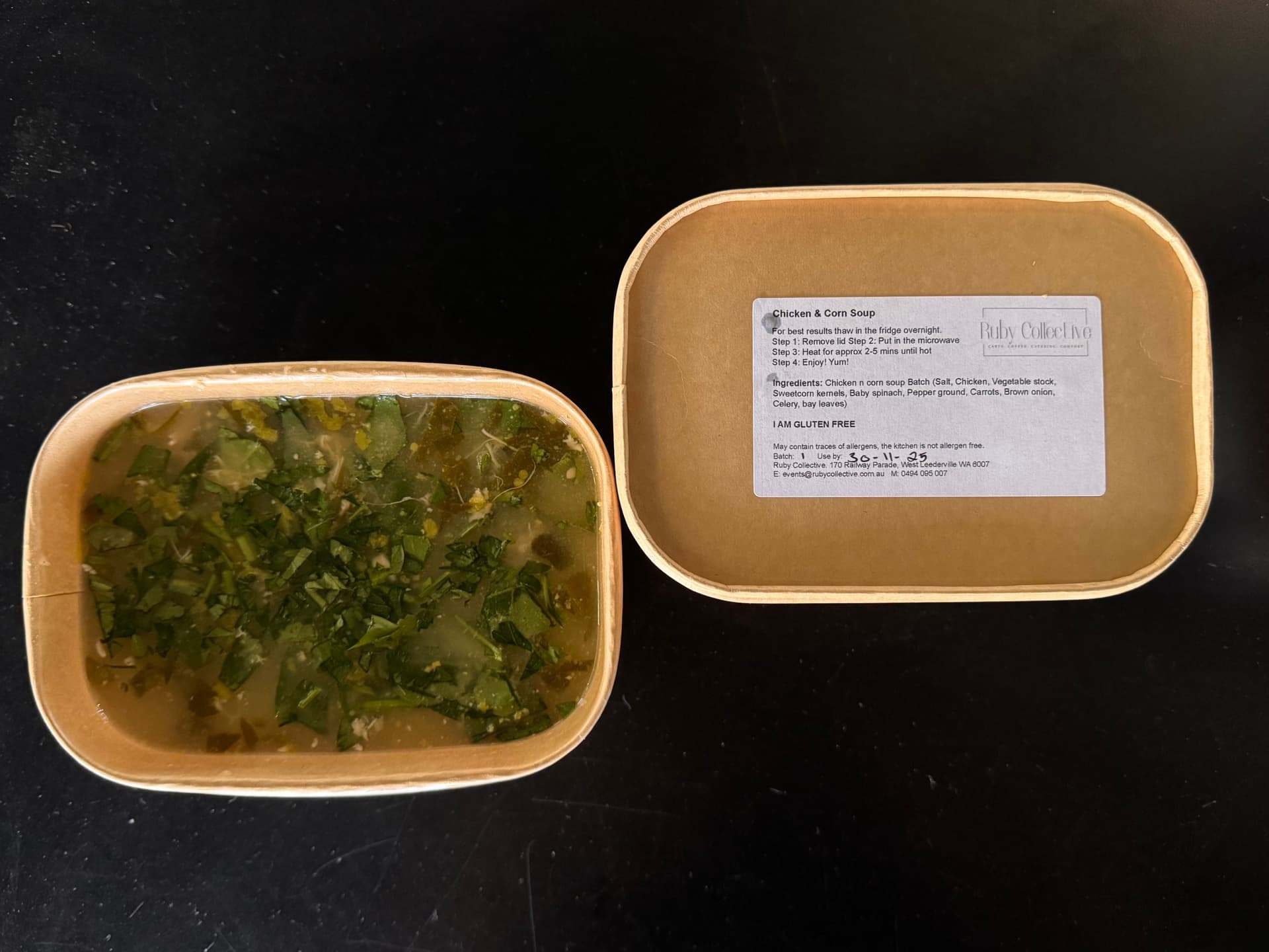 Chicken & Corn Soup A comforting, hearty classic made with tender chicken, sweet corn, and a savoury, slow-simmered broth. Small batch. Big flavour.